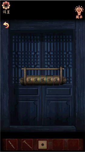 4、将【带孔木板】挂在墙壁的钉子上,根据线索,输入密码【楚霸魂恨汉】打开门锁。