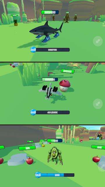 3. 操控鲨鱼、蘑菇等形象的角色,在绿色场景中收集资源(如苹果),与其他角色交互;