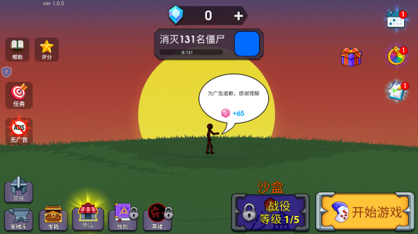 4、关卡启动后屏幕上方将显示任务目标,例如当前关卡需消灭131个僵尸单位方可通关。