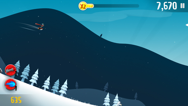玩家只需一根手指即可完成全部的滑雪动作。通过点击屏幕并按住可以让主角在下坡地段加速行进,而从左到右滑动屏幕则可以让漂浮在空中的主角做出无限旋转的花哨动作。