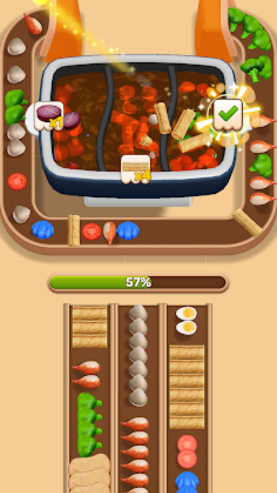 3、 烹饪时机与食材分类完美融合,点击翻转匹配食材,让火锅沸腾。