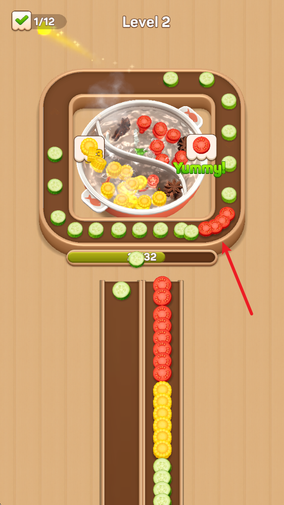 1、开始游戏后,点击食材即可围着火锅旋转,到达对应位置就会自动进入锅中。