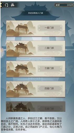 游戏中的门派有很多种,越高等级的门派星级越高,高星级的门派可以在掌门处学习到更高阶的功法,高阶功法则可以带来更高的属性提升。