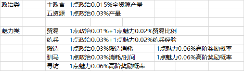 这张表体现了武将的政治和魅力属性,如何作用于11项内政功能。