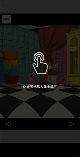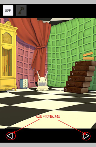 6、下一关,找兔子,分别在开局画面柜子红色机关处,开局画面杯子,开局画面左侧书页左下角,茶会桌上茶壶里,粉色房间黄色箱子里,开局画面对面钟表上,开局画面对面中间桌子后面以及开局画面左侧左下角开两扇门,浮出一只大兔子,然后就通关啦!