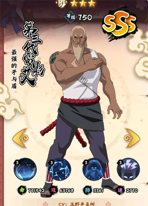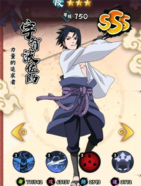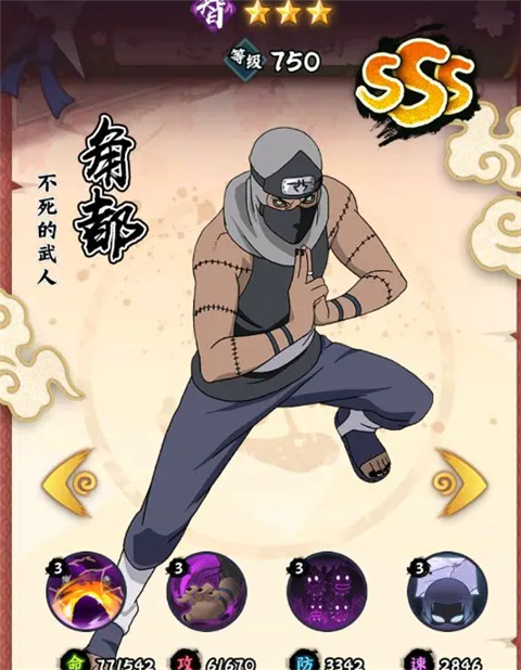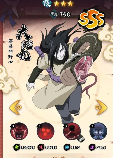3、大蛇丸+宇智波佐助+二尾由木人+黑土+山中井野+日向雏田搭配的中心思路还是:2-3个容易获得的SSS忍者+2-3个容易获得的SS忍者进行过渡,但是最终还是要培养全SSS,因此SS只需要适当培养即可。S级别的忍者不推荐培养