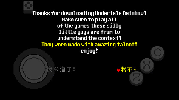 地域传说彩虹汉化移植是一款能够让玩家感受完整汉化游戏的传说之下系列的游戏内容之一,游戏中你还可以看到很多熟悉的角色,这些角色以及游戏的剧情让你感受全新的传说之下的内容,游戏的难度不算大,并且游戏中的操作也很简单,本站还有简单的教程让玩家轻松上手。