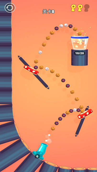 2、每成功装满桶完成一关,就能解锁一种新的大炮,新大炮会射出不同数量或特性的弹珠,增加玩法和挑战。