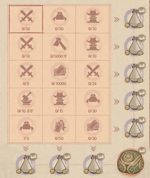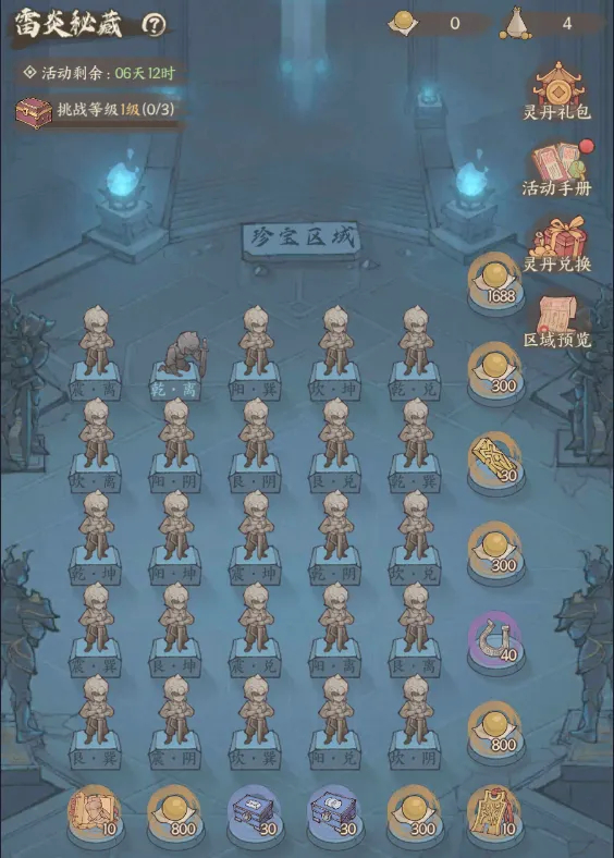 消耗纯元丹来激活阵位并击败石像,获得不同区域奖励。任意一行/列的石像被全部击败,可领取对应连线奖励,包含用于兑换联动县邑皮肤、客卿等限定奖励的涅槃丹。