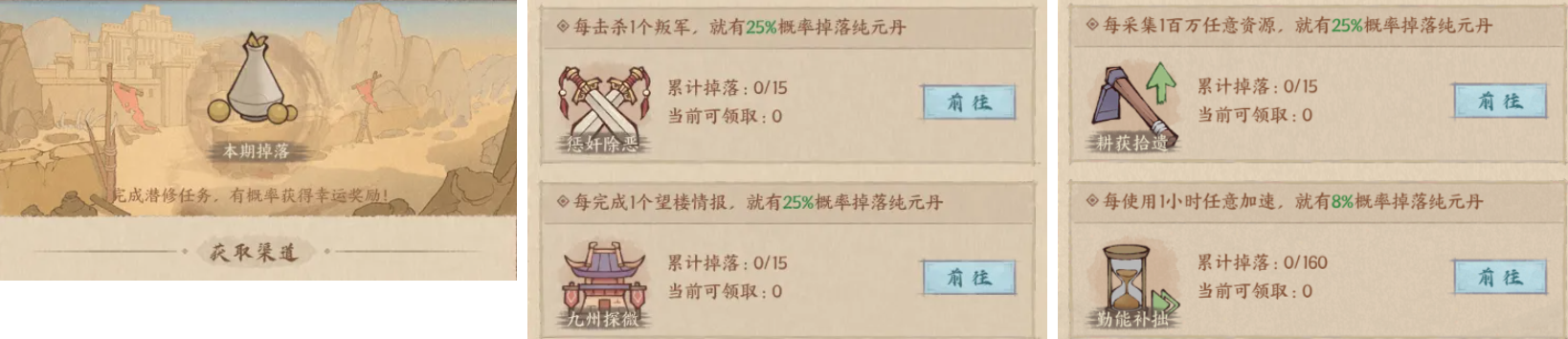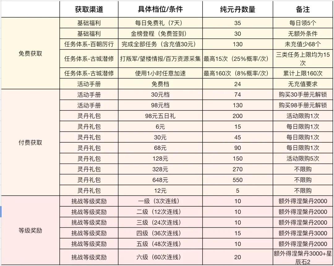 · 通过7日签到、免费礼包、免费手册、古城潜修和百朝历行活动任务,最多能获得356个免费纯元丹。