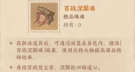 把这个阵旗放置在县邑建筑中,能够有效加快课业的精研速度,能节省大量的课业加速道具。