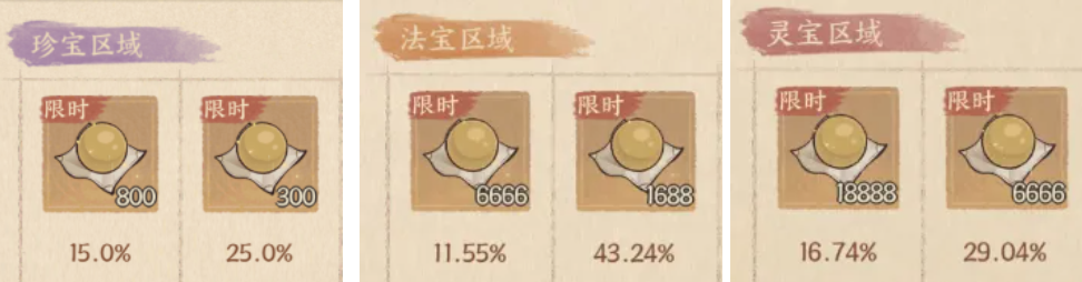 ④、珍宝→法宝,每达成一次连线,有2.5%概率进入法宝区域,因此抽满12次连线的话,最高概率为30%,体感抽满连线大约3-5轮出一次;