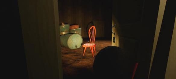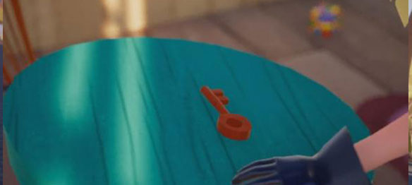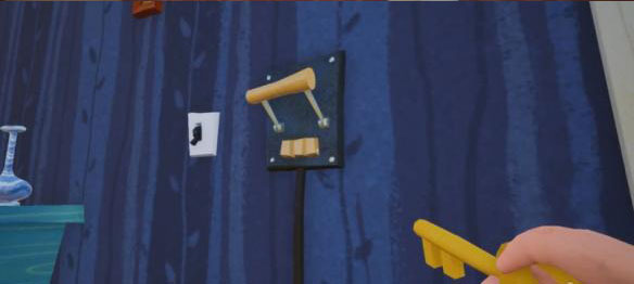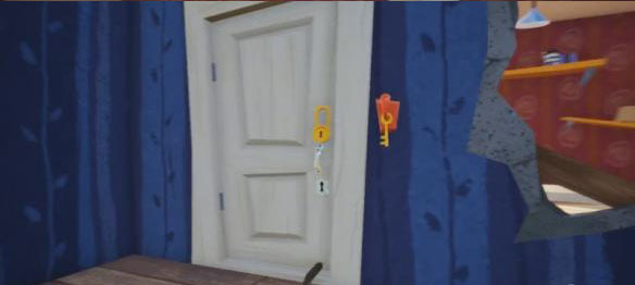 拿到蓝色桌子上的钥匙,去往一楼客厅,打开蓝色沙发旁边的黄色门,进入地下室。
