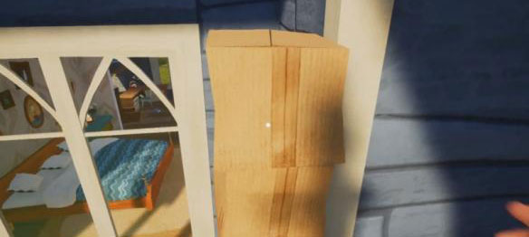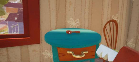 邻居家的钥匙在左边二楼红窗旁边蓝色的桌子上,在自己家一楼卧室拿到纸箱子,去邻居家门口左边梯子上去放上两个纸箱子,然后跳到屋檐上。