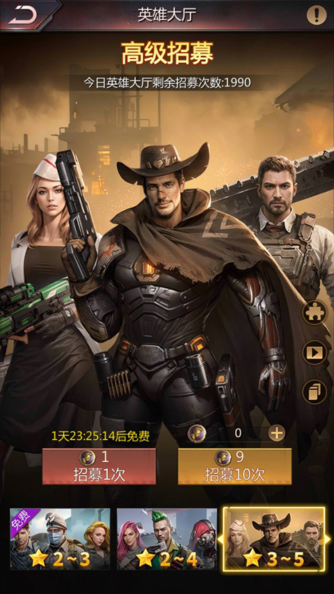 5、玩家可以在英雄大厅进行英雄的招募,游戏大厅有2~3星、2~4星、3~5星三种英雄卡池,星级越高,英雄品质就越好,玩家消耗招募币即可进行英雄招募。