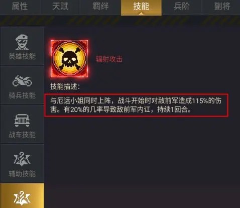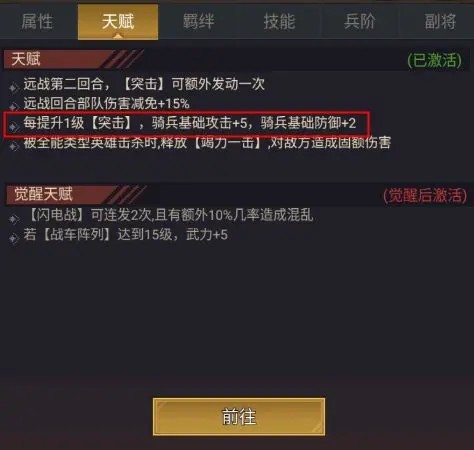 天赋:每个英雄拥有不同的天赋技能,这里需要留意英雄的天赋是否与固定技能有加成。如末日邮差,每提升1级【突击】,骑兵基础攻击+5,骑兵基础防御+2;