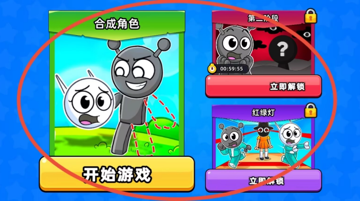 1、游戏初始提供三种模式选项,其中两项需达成条件解锁,基础模式支持角色合成玩法。