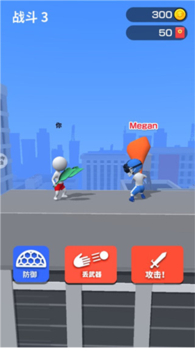 3、进入战斗之后,你可以选择向前进攻或者扔出你的武器攻击对手,在对手攻击你时,你可以进行防御;