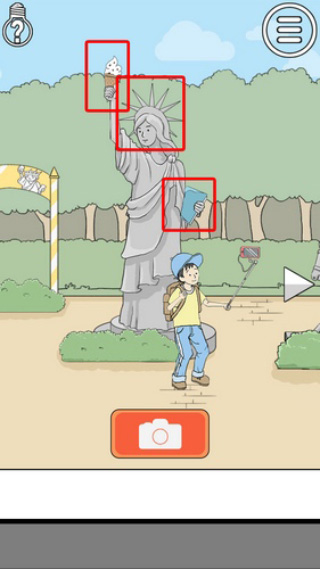 10、查看主角的书包,在书包里找到书本(圣经),向右切换场景,在妈妈身后的车轮上取下花纹(皇冠),在女儿手上找到冰淇淋(火炬)!将书本(圣经),冰淇淋(火炬),花纹(皇冠)放到雕像(自由女神像)上,再点击按钮拍照即可顺利过关!