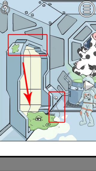 30、向右切换场景,拾取照相机。将照相机给主角,主角会拍照闪瞎四眼怪物,我们就能安全拾取梯子上的电线,向左切换场景,点击变大装置将奶牛变大一圈,然后点击奶牛,牛奶会将地上的绿色液体融化!装上电线,点击变大装置将奶牛再变大一圈,然后点击奶牛,牛奶会打下怪物,然后怪物会触电而死,取下电线,在点击左边的门,即可顺利过关!