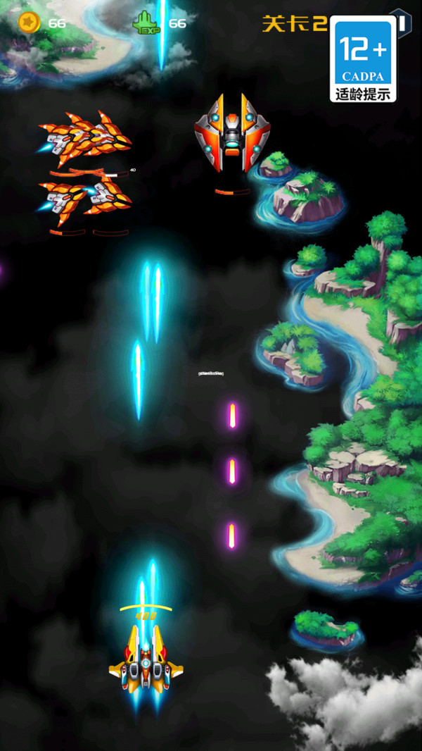 游戏采用竖屏操作模式,玩家单指滑动控制飞机移动,自动发射子弹攻击敌人。每关敌机编队密集,弹幕交错复杂,需灵活走位躲避“子弹雨”,尤其在面对BOSS时,需掌握其技能释放节奏,在攻击间隙集中输出。