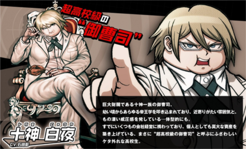 巨大财团——十神财团的继承人。由于需要继承家族的传统,从小就接受帝王式教育的精英。非常要面子,而且有着非常轻视别人的性格。喜欢上层生活和精英人生的品味。爱吃美味的东西,态度极度傲慢,实际上是个好人。