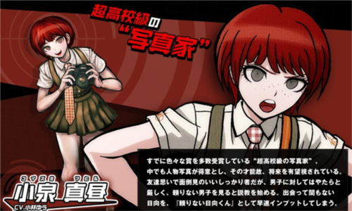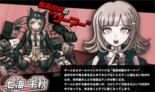 十分擅长攻略游戏的无口女生,身着一件黑猫兜帽衫。除了galgame外,不管哪种类型的电玩游戏,都能手到擒拿的超级游戏神人。其集中力强到一边自我介绍、一边玩游戏的程度,不过平常一旦松懈就会想睡觉。在搜查和学级裁判的时候总是给日向很多帮助。和狛枝一起被黑白熊称为“学级裁判的得分手”。