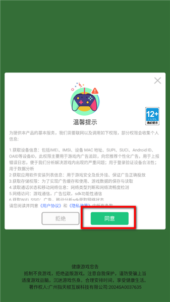 1、打开游戏之后首先需要同意温馨提示。