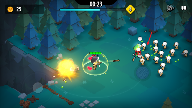 1、黑夜中,拖动摇杆控制角色移动,消灭靠近的敌人,并且会掉落经验。