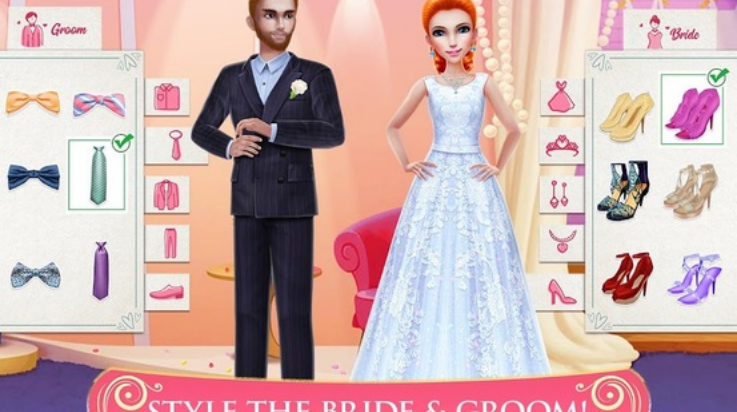 5、装扮整个婚礼派对 - 新娘,新郎,伴娘,伴郎。每一位都需要你专业的设计!为新娘挑选一个炫美的皇冠,为新郎挑选一件帅气的晚礼服。装扮完成后就带他们去美容沙龙吧!