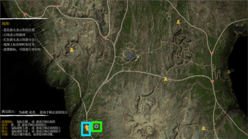 4、打开地图,发现这个小岛还挺大的,小屋在绿色方框内,我们现在所在位置在蓝色方框内;