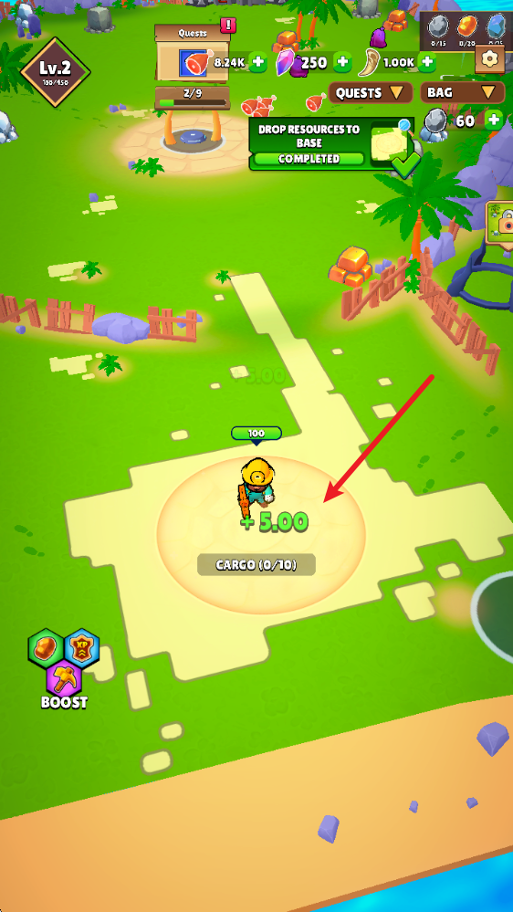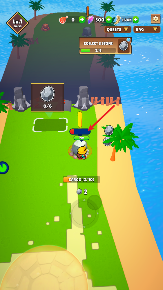 1、游戏中拖动屏幕进行移动,靠近物品即可拿起镐子进行采集。