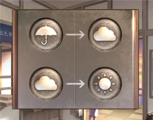 查看左边的窗口,是放了书的那个,上面的图案花了两个箭头,所以按照天气调节上面的是今天的小雨转阴,下面的是明天的阴转晴,两个一样的图案肯定是阴了,那么太阳就是晴雨伞就是小雨了,所以放入四个硬币就是伞-云-云-太阳,放好后打开窗口拿到后面的一个透明零件。