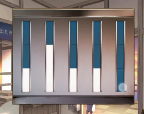 查看窗口后面的盒子,调整为恋爱相合伞,这里没有伞字,所以我们就用伞的图案代替了,调整完毕打开盒子拿到一副墨镜,这么灿烂的色彩也只能适配一下外面的站牌了,所以出门查看一下站台上的站牌,使用太阳镜后就只剩下了雨宫两个字,回到屋里查看最左侧的窗口,点击邮戳选择雨宫就能获得车票了,把车票交给npc本章结束。