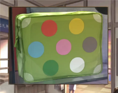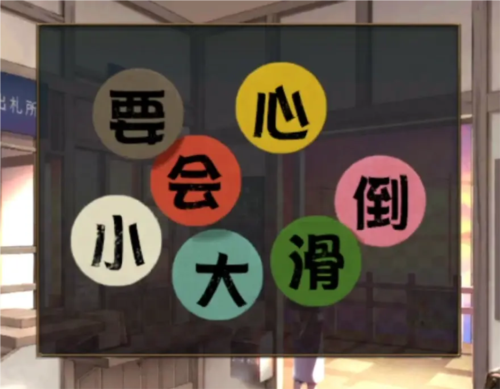 查看一下我们前面用检票钳获得的小圆纸片,外面木板上的字是小心会滑倒,也就是纸片上的白色-黄色-红色-绿色-粉色,然后对应到包包里面小袋子的位置,就是右下角-右上角-左上角-左下角-中间,所以按照这个顺序按下密码锁就能打开包包了,将里面右下角折起来的纸片拿出来交给npc本章结束。
