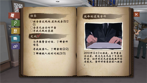 2、调查过程中所收集到的证据都会显示在证据页中,玩家可以随时查看。