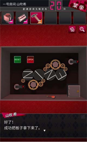 来到板前,装上齿轮和纱布,转动两边力臂,调整字母得到“NINE”,再点击“OPEN”,获得钥匙。