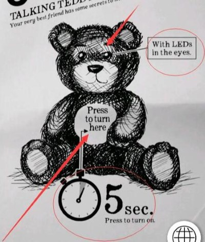 2、一则泰迪熊使用广告,需要按住5秒可以打开泰迪熊眼里的灯。