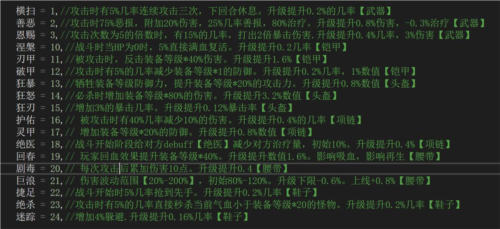 【主要属性】是装备的主要属性。没有副作用的加成【附加属性】附加属性主要加强三维属性。有负属性的概率。【强化属性】强化的是装备栏,不跟随装备的。只要穿着装备都受到强化【符文】是一种辅助特性。【特技】是一种战斗特性技能。通过不同的特技碎片达到杀敌效果【套装】是对技能的补充。如想刀刀暴击,手机必杀套。如向次次连击,收集连击套