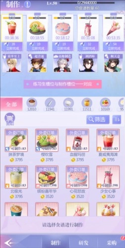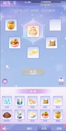 拿到食材后,老板拿到了可以通过【研发】制作的食谱,包括各种冰淇淋、蛋糕、饮料。研发本身不会消耗食材,所以老板可以随意尝试。