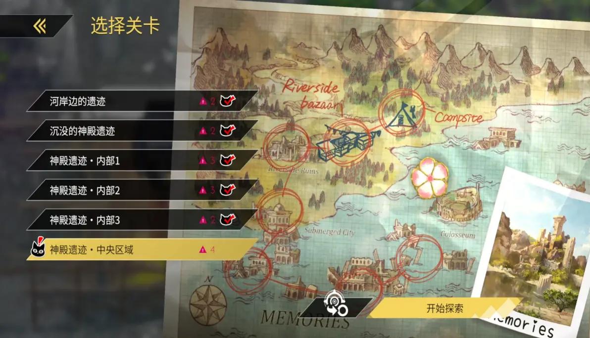 2、跟随着这条主线,玩家将前往大地图上的不同区域展开冒险(每个区域相当于一个章节,对应不同的探索区域,解锁后可随意切换,即能够游玩之前打过的关卡)。