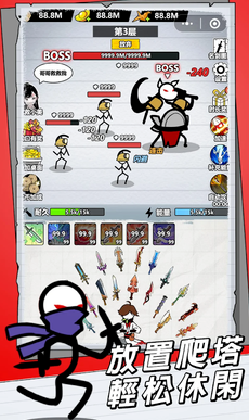 3、轻松放置体验:无需时刻紧盯屏幕,一键开启挂机模式,角色自动战斗、收割资源,爬塔升级轻松无忧,完美适配碎片化时间。