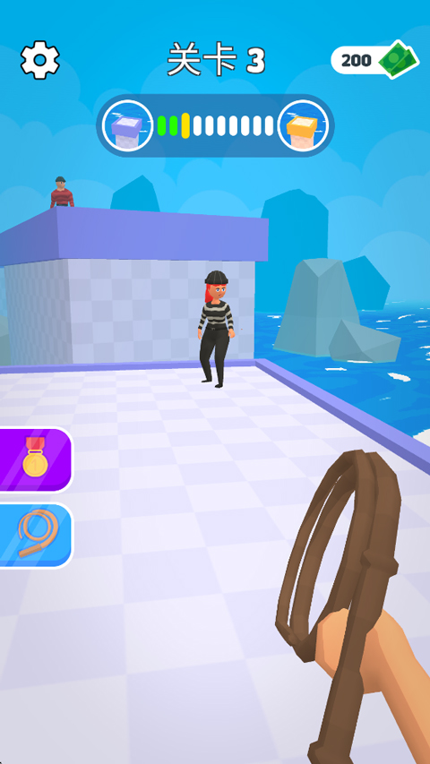 皮鞭大师游戏是一个有趣的休闲益智闯关游戏!玩家可以通过点击屏幕发射皮鞭,玩家可以通过用皮鞭将敌人爆头击败敌人或用皮鞭抓住敌人扔出场外,一路过关闯将到达终点,就能获得终点的宝箱奖励!