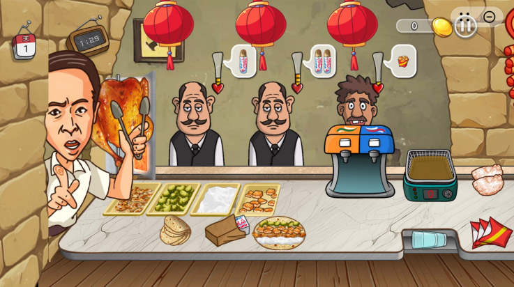 3、订单处理系统:顾客头顶气泡实时显示需求,玩家需快速选择食材进行裹粉、油炸,并搭配对应饮品完成订单,避免因等待时间过长导致跑单。