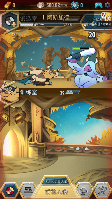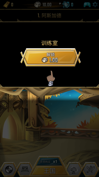 1、解锁并升级殿堂,生产成堆的金币。