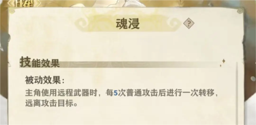 主角使用远程武器时,每5次普通攻击后进行一次转移,远离攻击目标。