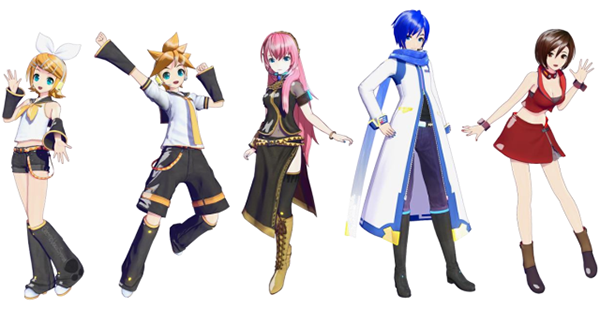 (左起)镜音RIN、镜音REN、巡音LUKA、MEIKO、KAITO