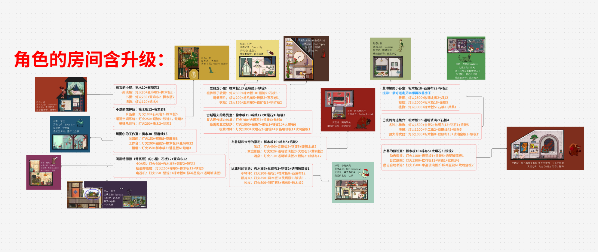 就是完成每个灵魂的所有房屋升级任务,升级所需材料如下:
