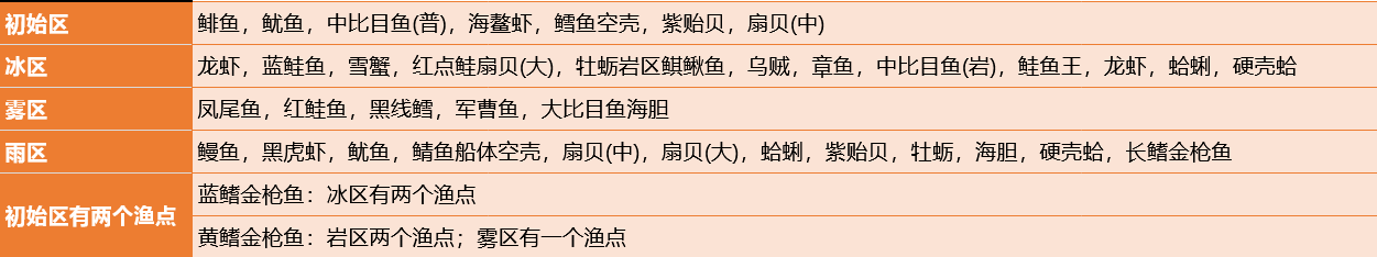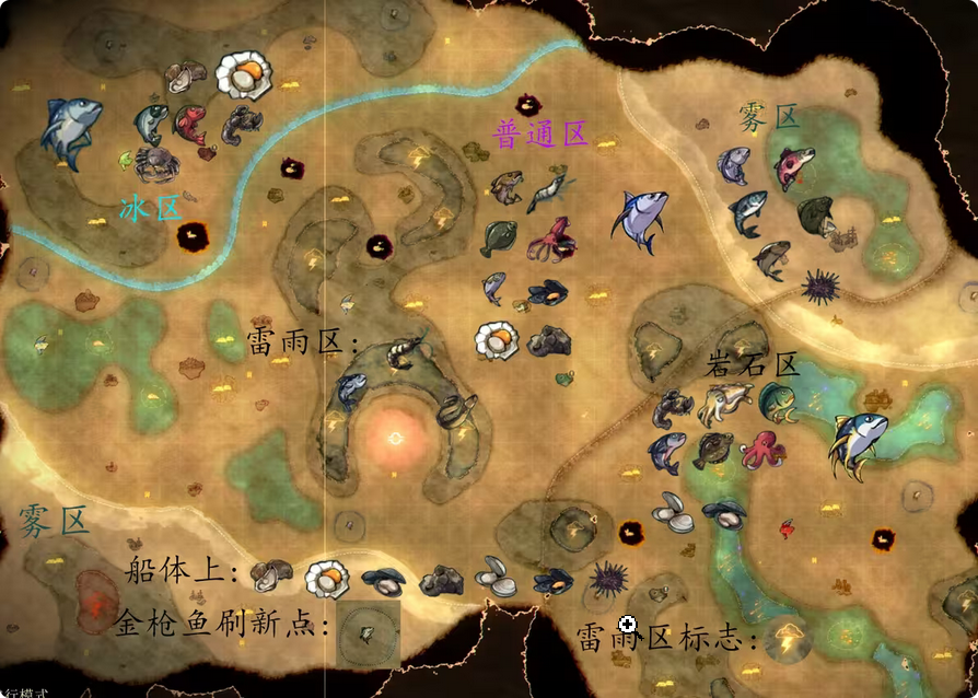 除初始的普通海域外,按照探索进度,还有冰川区、岩区、雾区等多个区域可供探索,不过这些地方都需要在船上安装特定设备之后才可进入(例如去冰区要安破冰器,去石区要安石头破坏者)