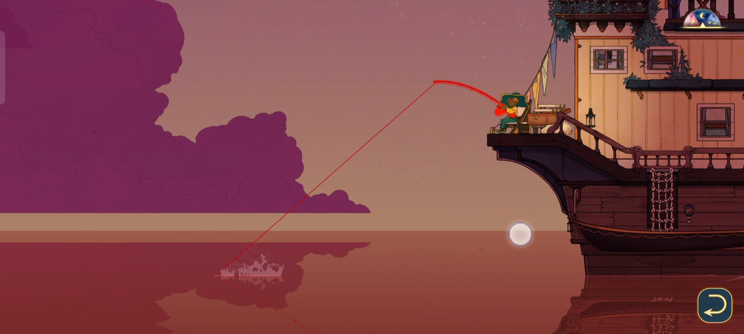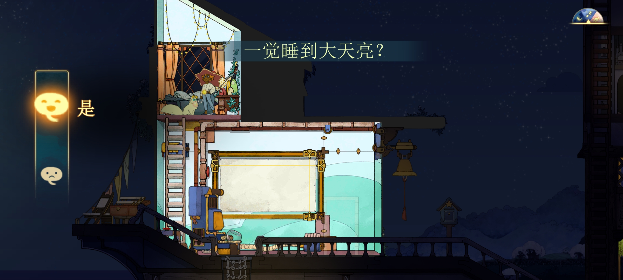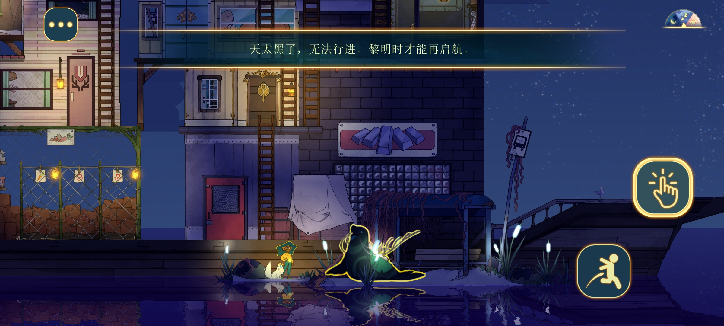 游戏中的一天被分为黎明、白天、黄昏、夜晚、黑夜(睡觉时间)五个时间段,其中黑夜无法行船,可以选择睡一觉💤直到黎明,也可以通宵干活,身为永恒之光,不睡觉也不累